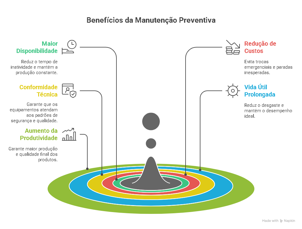 - Aumento da produtividade: máquinas operando com eficiência garantem maior produção e qualidade final dos produtos.